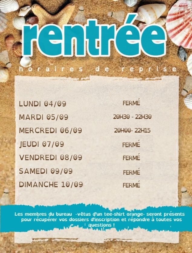 – ❗️Pas de bad le jeudi 7 et samedi 9 septembre en raison de l’organisation de la journée des associations❗️