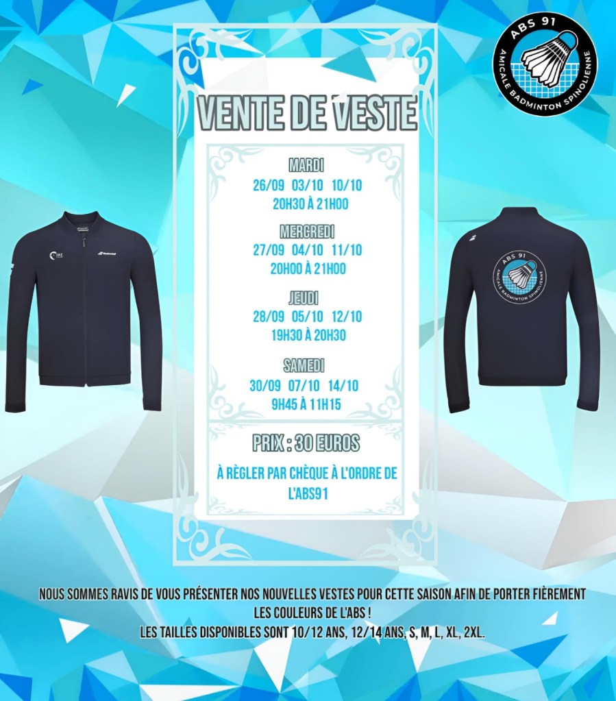 Cette semaine sera lâopportunitĂ© pour tous les adhĂ©rents dâessayer la veste Babolat de lâABS version 2023-2024. Tous les dĂ©tails de mise en vente sont notifiĂ©s ci-dessus!